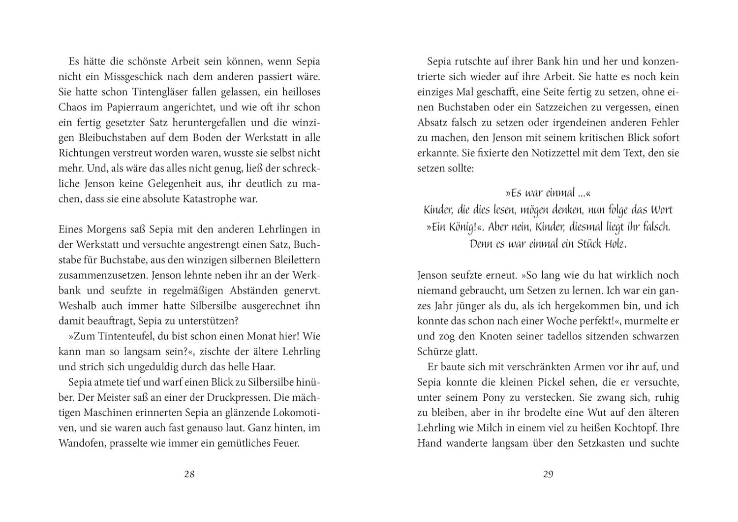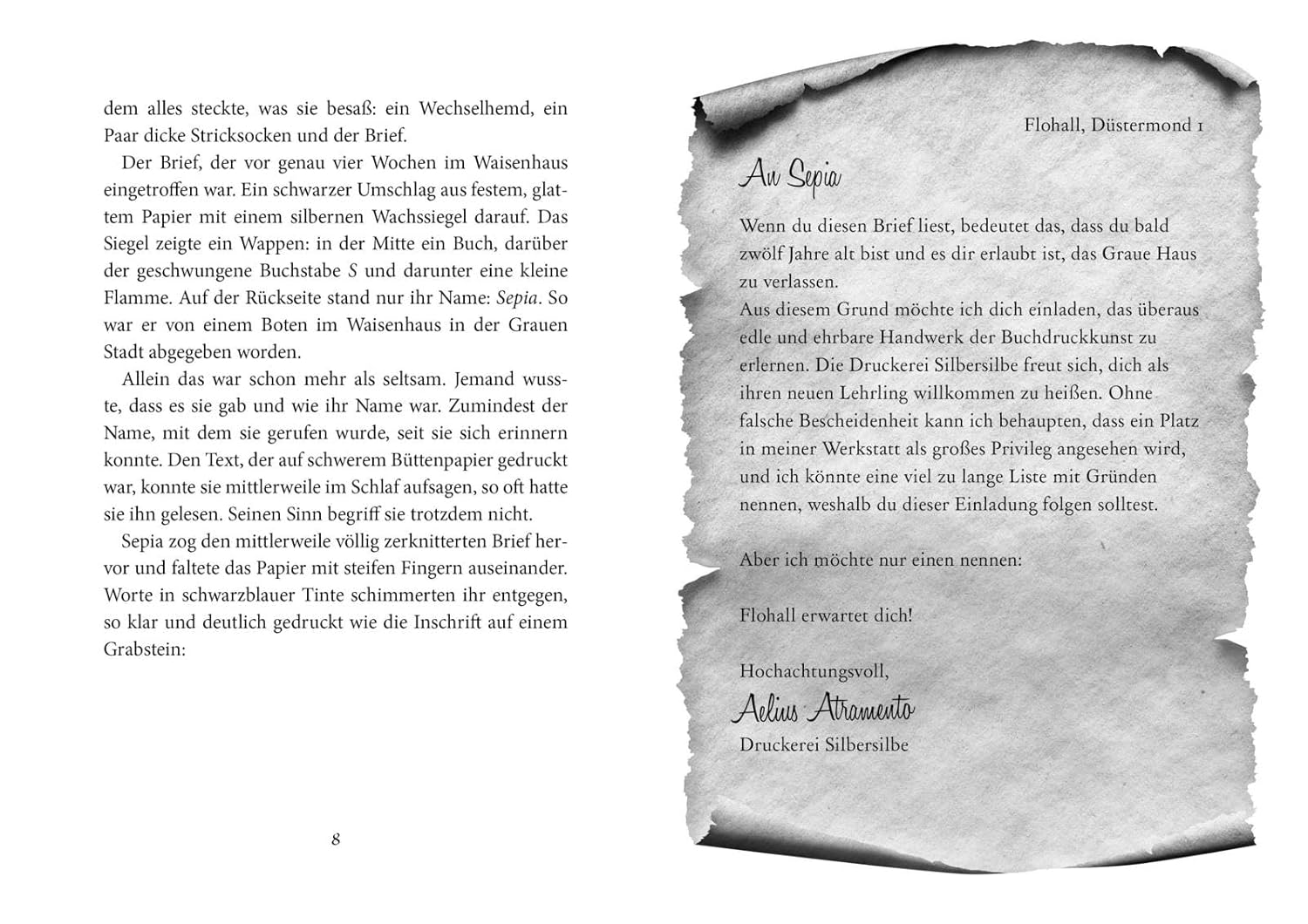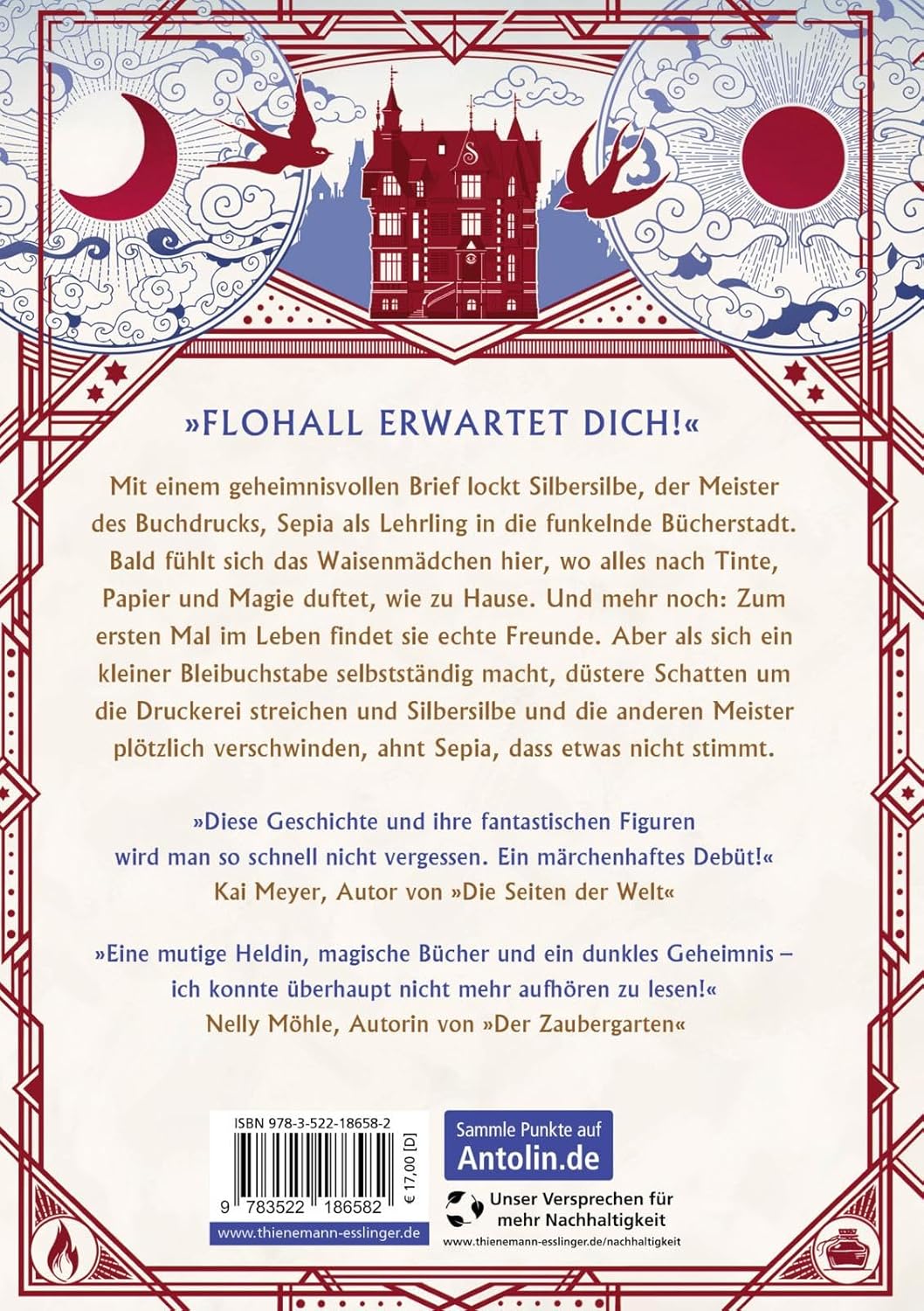Dass in Flohall Tinte und Bücher wertvoller sind als Gold merkt die zwölfjährige Sepia schon bei ihrer Ankunft in der berühmten Hafenstadt mit ihrer duftenden Tinte und dem flüsternden Papier. Bei Silbersilbe, einem der drei großen Meister, soll sie das Handwerk des Buchdrucks lernen. Warum wurde gerade sie ausgewählt – ein tollpatschiges Waisenmädchen, das ständig Tintenflecken an den Fingern hat? Bald findet Sepia in Niki und Sanzio treue Freunde und erlebt ihr erstes Funkelfest. Doch es geschehen merkwürdige Dinge in Flohall. Tinte geht verloren, düstere Gestalten schleichen umher, und dann verschwinden die Meister. Sepia ahnt, dass das mit dem Tintenkrieg zu tun hat, und mit einem dunklen Alchemisten, den alle für längst besiegt gehalten haben.