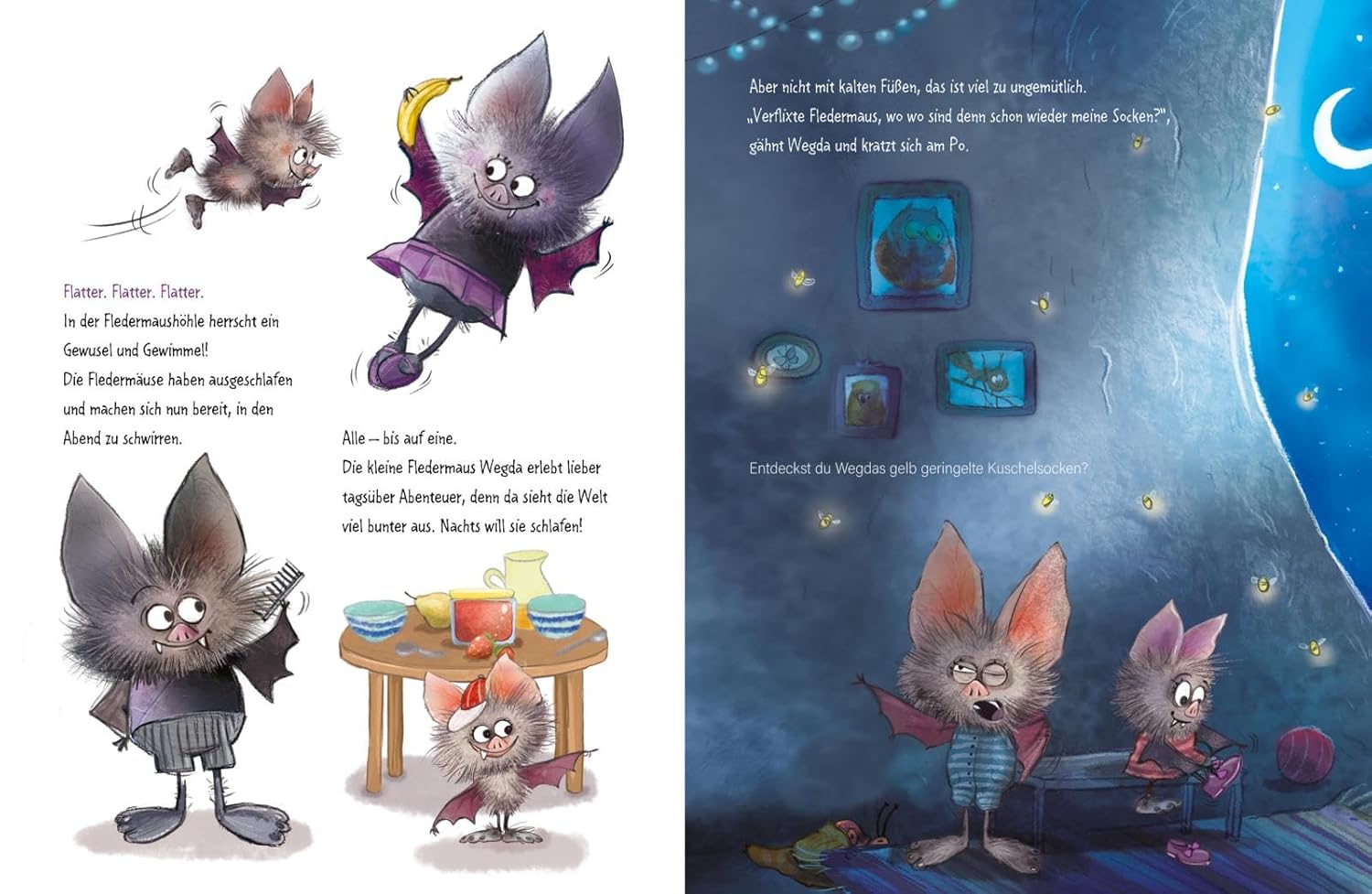 Die kleine Fledermaus Wegda ist eine ganz besondere Fledermaus. Sie ist ganz schön tollpatschig und total lustig, sie hat den Kopf voller Ideen und möchte ganz viele Abenteuer erleben. Aber tagsüber. Denn nachts, wenn es dunkel ist und alle anderen Fledermäuse aus der Höhle schwirren, möchte Wegda schlafen. Außerdem ist ie kleine Fledermaus Wegda so ein ganz klitzekleines bisschen chaotisch ist.