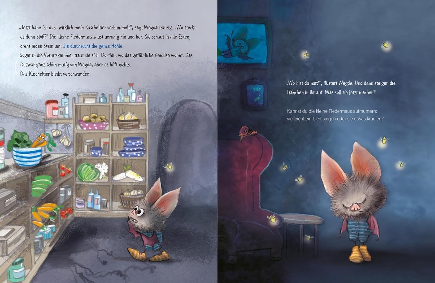 Was die kleine Fledermaus Wegda nun tut, wen sie um Hilfe bittet und ob sie ihr liebstes Kuscheltier wiederfindet – davon erzählt dieses ganz wunderbar liebevolle Bilderbuch.