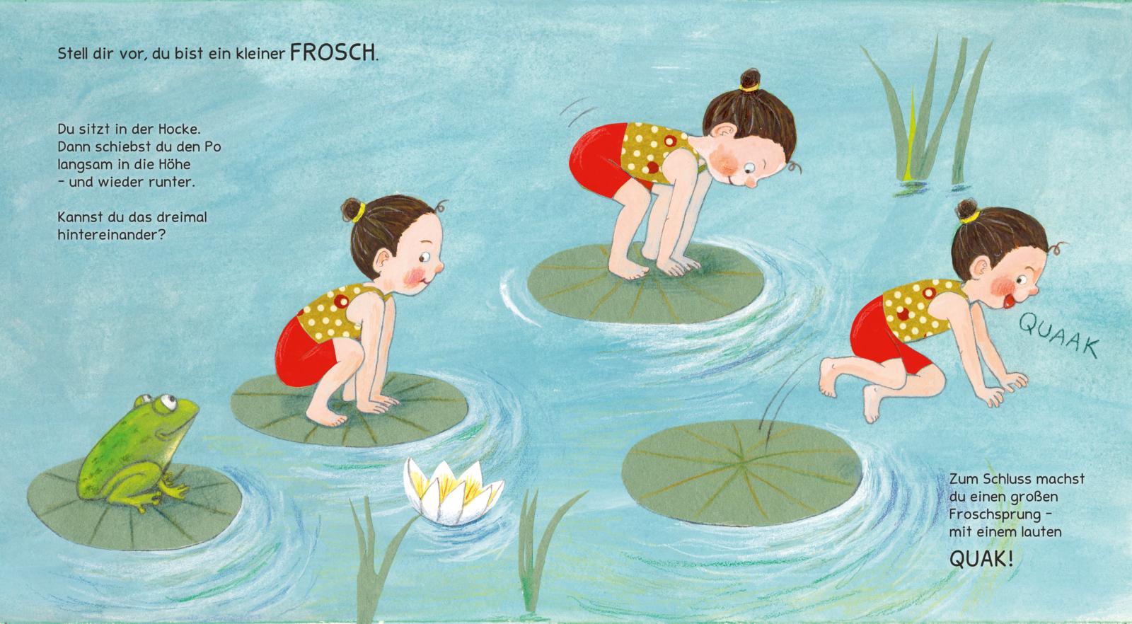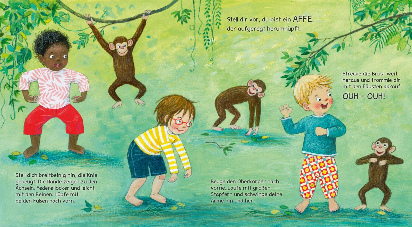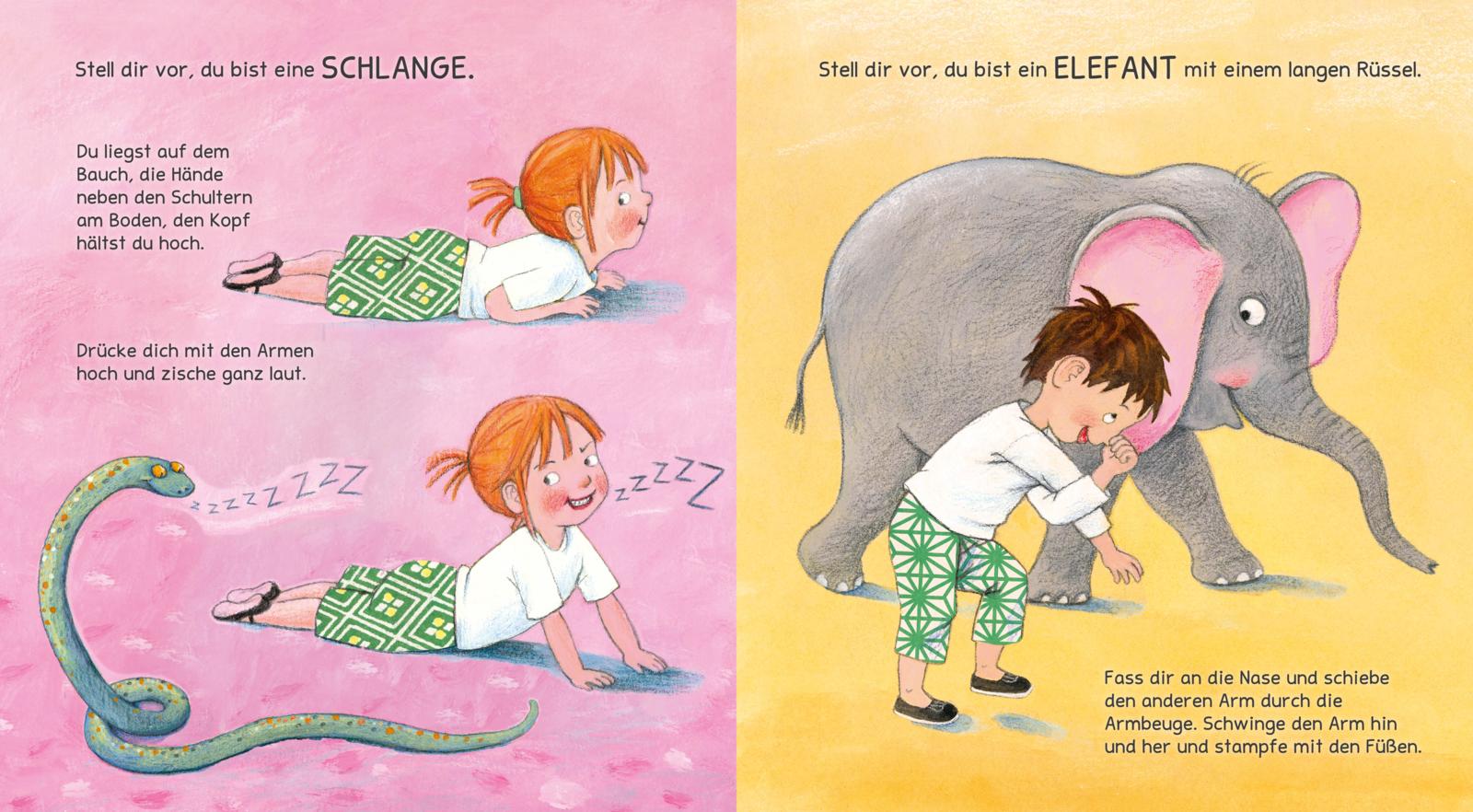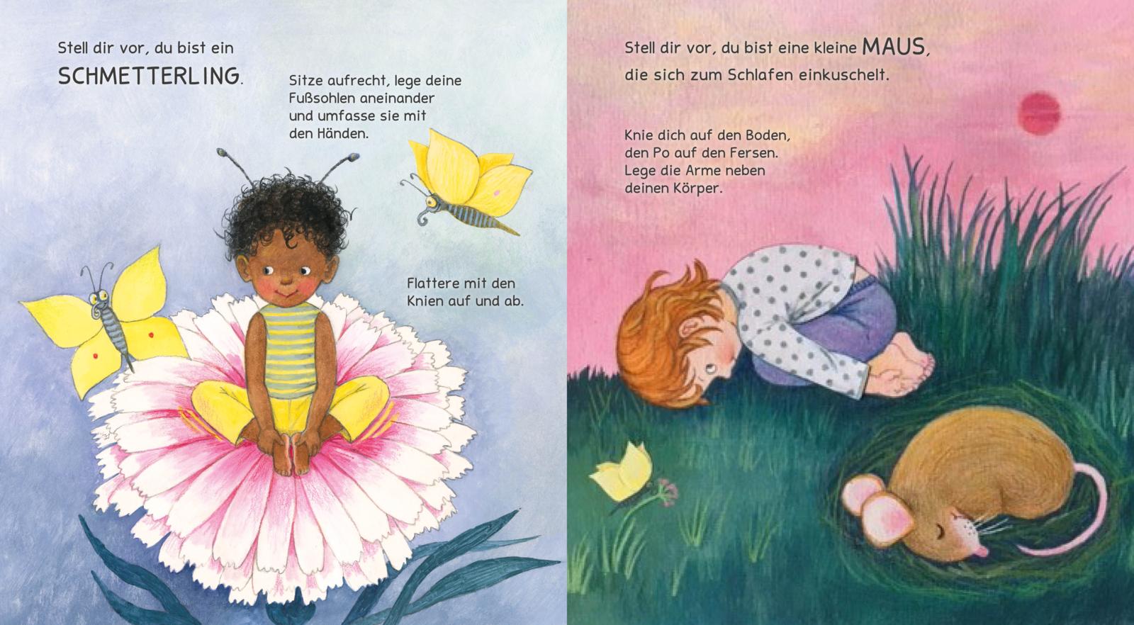 Die Übungen lassen sich allein, mit Papa, mit Mama oder mit den Erzieher*innen in der Kitagruppe ausführen, denn in zahlreichen Kindergärten ist Yoga ein fester Bestandteil der Turn- und Bewegungsstunde.