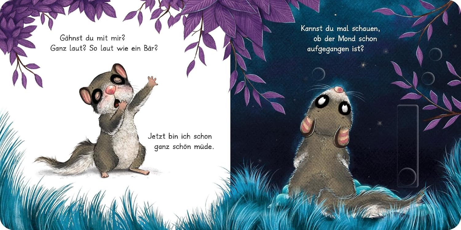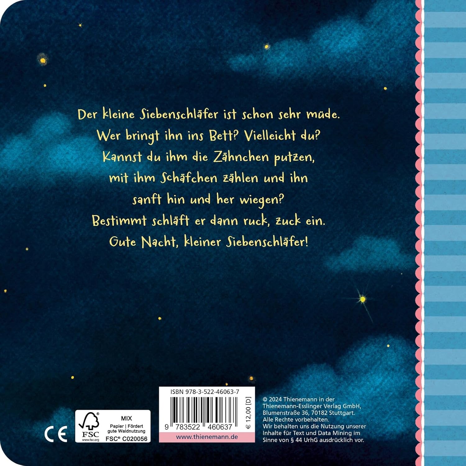 Der kleinen Siebenschläfer ist sooo müde, aber wer bringt ihn ins Bett? Diese interaktive Schiebepappe macht das Einschlafen zu einem zauberhaften Ritual, bei dem das Kind mithelfen kann. Zuerst werden dem kleinen Siebenschläfer die Zähne geputzt, dann zählen wir gemeinsam Schäfchen. Das Kind wiegt ihn sanft in seinem Schnuffeltuch und schaut nach, ob der Mond schon aufgegangen ist. Zum Schluss wird der Siebenschläfer mit seiner Schnuffeldecke zugedeckt.