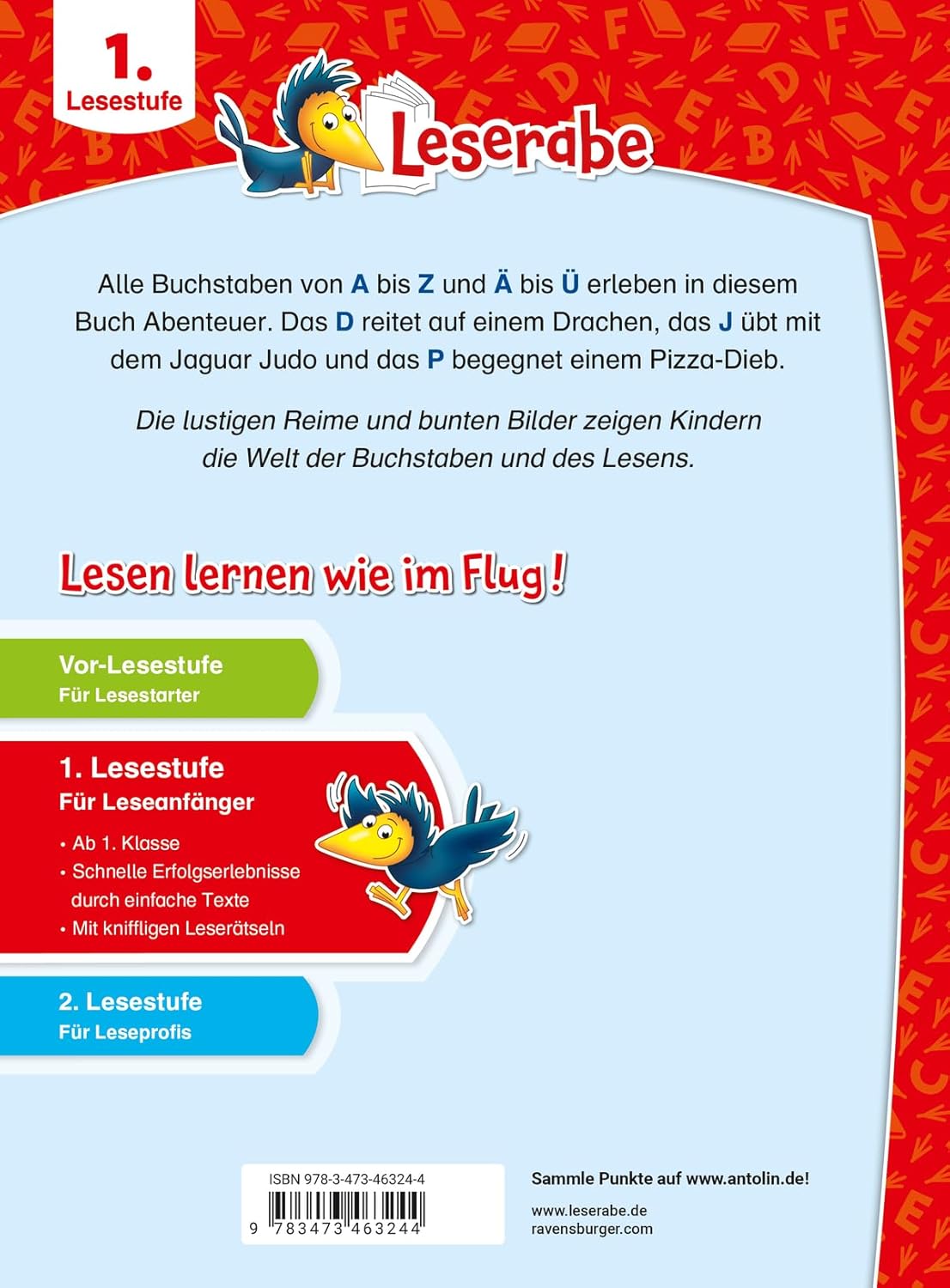 Alle Buchstaben von A bis Z und Ä bis Ü erleben in diesem Buch kleine und große Abenteuer. Die kurzen Texte, witzigen Reime und bunten Bilder sorgen für den perfekten Einstieg in die Welt der Buchstaben und des Lesens. So macht Lesenlernen Spaß.