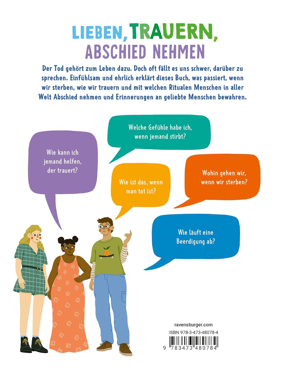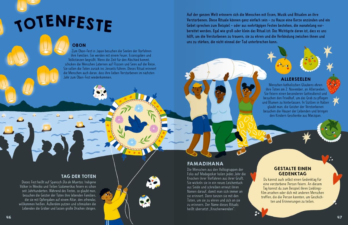 Der Tod gehört zum Leben. Kindern wie Erwachsenen fällt das Sprechen über ihn aber oft schwer. Dieses Buch hilft dabei, die Sprachlosigkeit zu überwinden. Die Leser erfahren etwas über umweltfreundliche Bestattungsmethoden, erkunden die Katakomben von Paris oder feiern den Tag der Toten in Mexiko. Dieses Buch kann die Trauer über einen erlittenen Verlust nicht nehmen, aber es kann helfen, Formen des Andenkens und des Trauerns zu entwickeln, die bei der Verarbeitung des Erlebten weiterhelfen.