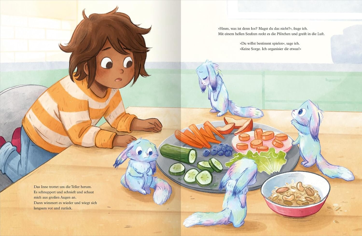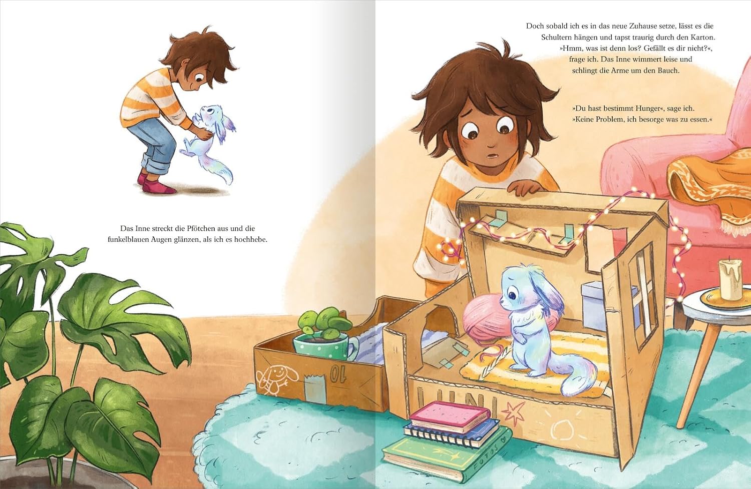 Joni findet beim Nachhausekommen ein leichtes Paket mit Luftlöchern. Was kann da nur drin sein? Es ist ein kleines, flauschiges Inne. Das ist bestimmt wie ein Kaninchen, sicher braucht es ein Gehege, Spielzeug und Futter. Doch all das macht das Inne nicht glücklich. Es will einfach nur im Arm gehalten werden ...