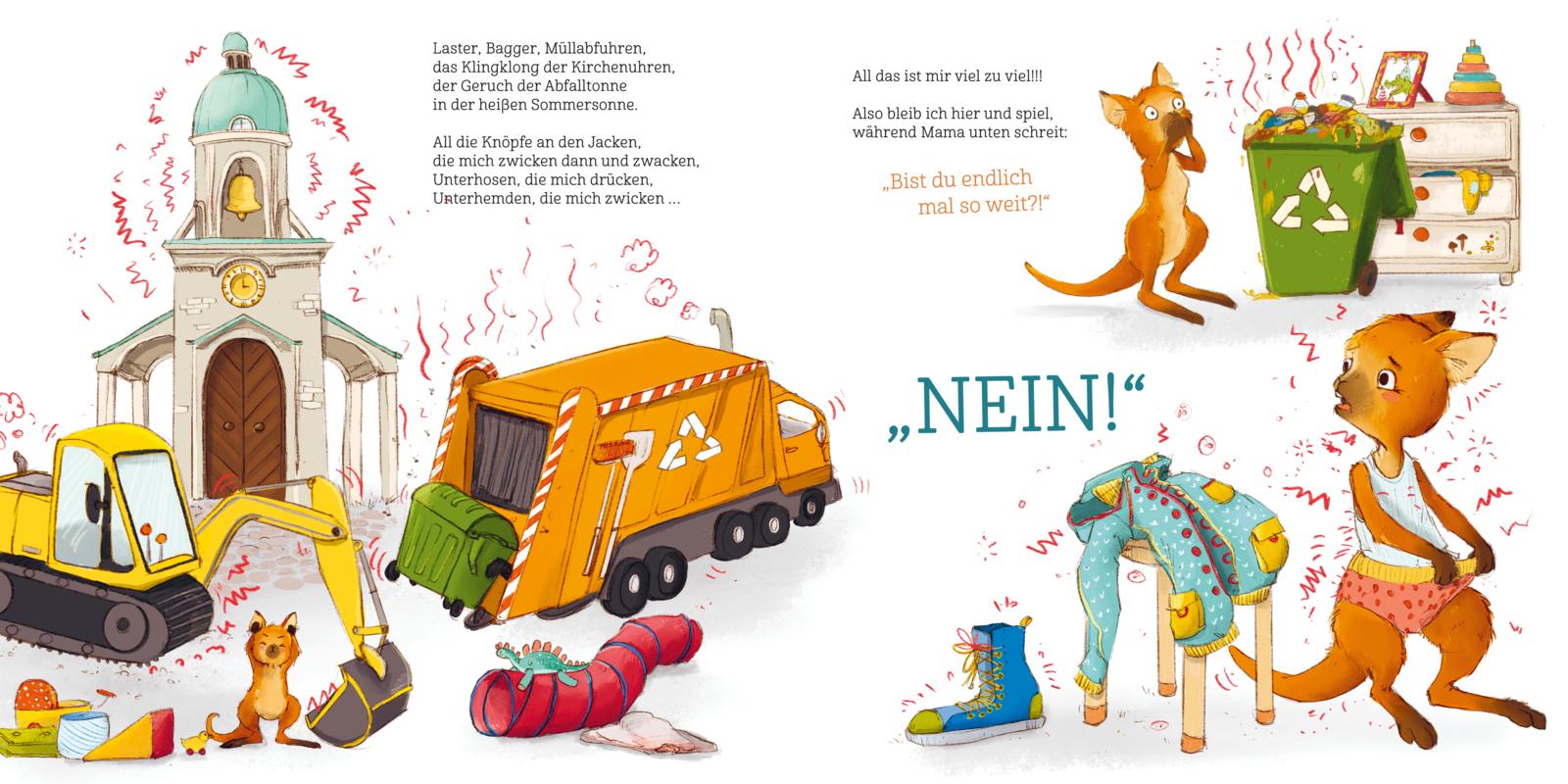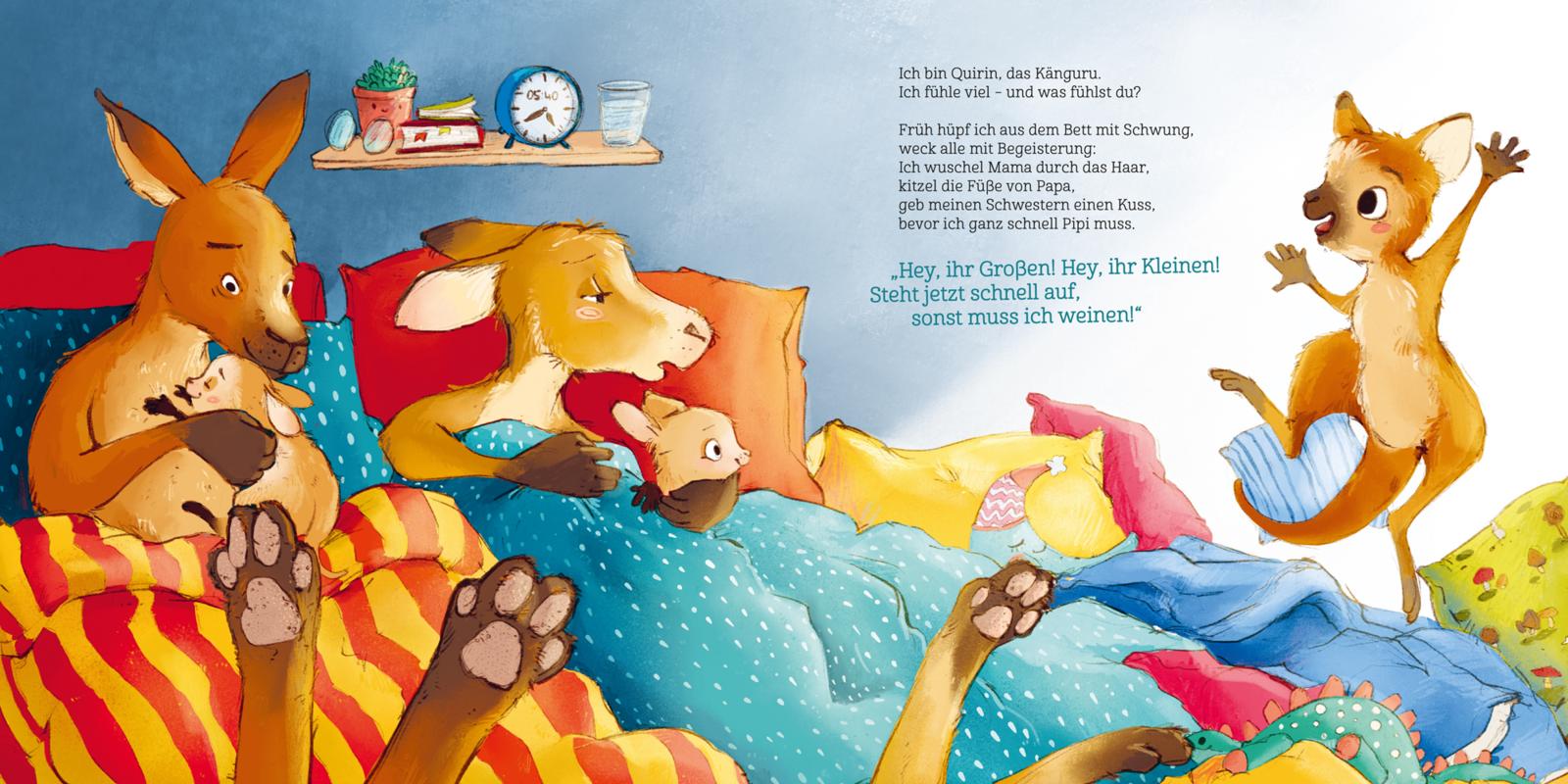 Es ist noch dunkel und schon springt das Kängurukind Quirin begeistert und voller Energie in den neuen Tag hinein. Doch schnell kann die Stimmung kippen! Da stehen die Eltern nicht rasch genug morgens auf - und Quirin bricht in Tränen aus. Dort heißt es: Anziehen! Losgehen! Und wütend springt Quirin davon. Dann zwickt die Hose, stören die Knöpfe und draußen erwartet ihn all das Schnelle, Schrille, Stinkige! NEIN! Quirin steckt in einer Achterbahnfahrt der großen Gefühle. Zum Glück weiß Mama Rat: Beutel auf, Quirin rein, Beutel zu, Quirin kommt zur Ruh! Co-Regulation á la Känguru!