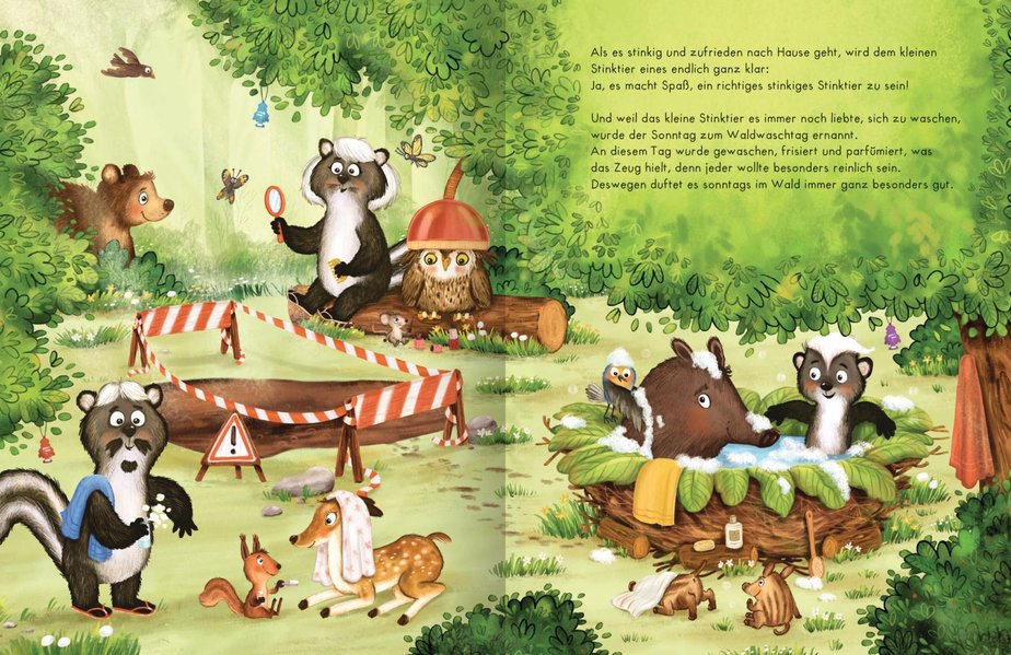 Die zweite Geschichte erzählt auf lustige Weise eine Geschichte über das Anderssein. Denn das kleine Stinktier Riechtsogut will überhaupt nicht stinken!