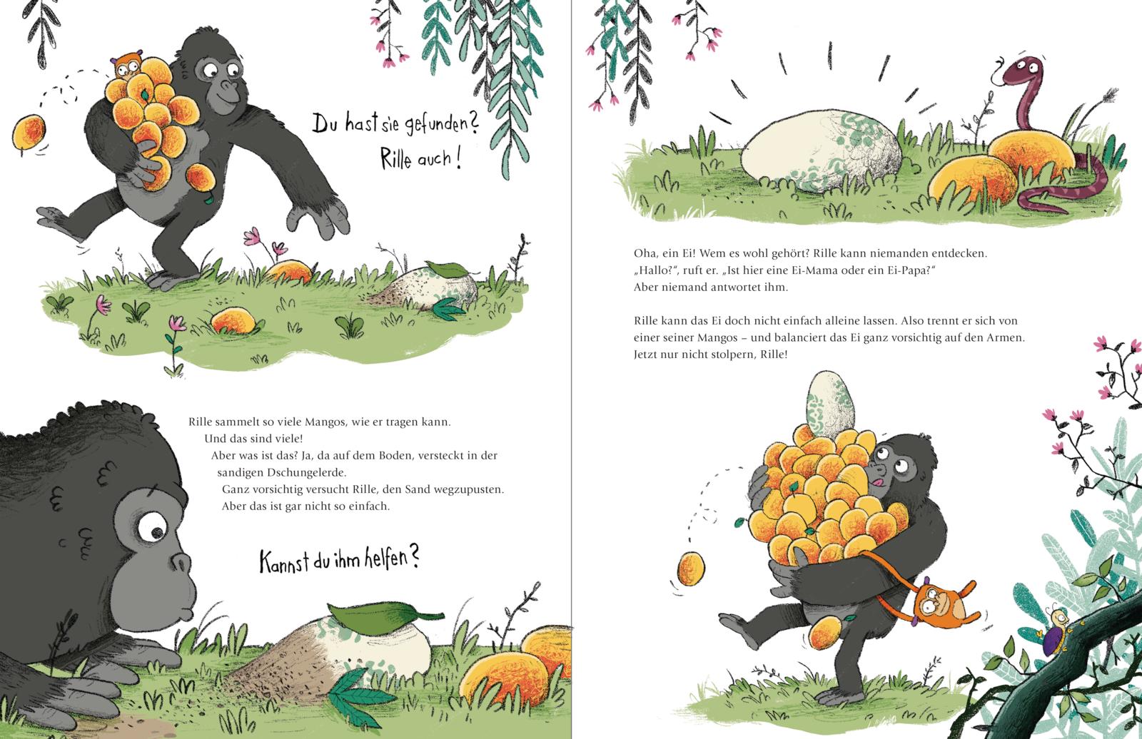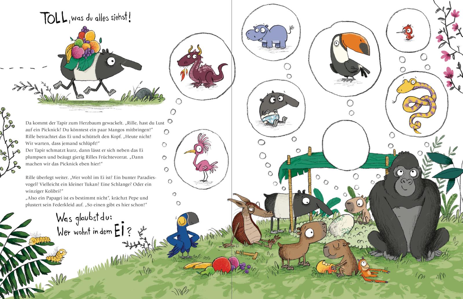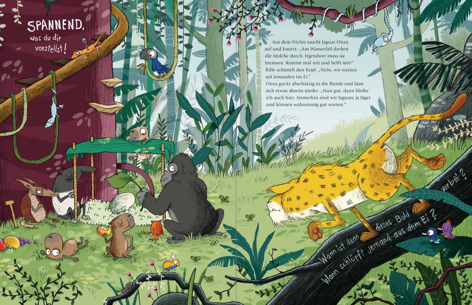 Rille entdeckt mitten im Dschungel ein Ei! Wer da wohl rauschlüpfen wird? Neugierig nimmt Rille das geheimnisvolle Ding mit nach Hause. Er bettet es auf ein Nest aus weichem Moos und wärmenden Blättern. Jetzt braucht er nur noch etwas Geduld. Aber Warten findet Rille gar nicht toll. Bis seine Freunde, Papagei Pepe, Gürteltierdame Tatu und die frechen Wasserschweine ihm zeigen, wie schnell ganz „bald“ kommen kann … Denn mit ein bisschen Fantasie und lustigen Spielen knackt die Schale im Nu, wetten?