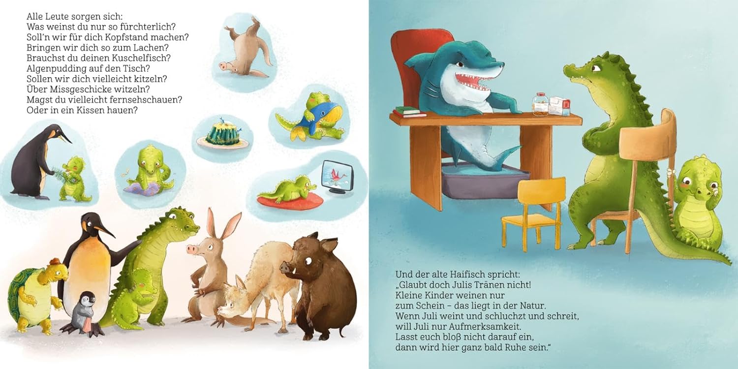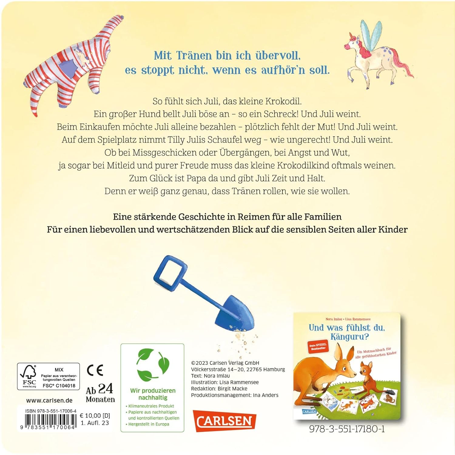 Juli, das kleine Krokodil, hat gar keine dicke Krokodilshaut, sondern ist sehr durchlässig. Schnell füllen sich die Augen des Krokodilkindes mit Tränen. Ob bei Missgeschicken oder Übergängen, bei Angst und Wut, ja sogar bei Mitleid und purer Freude muss das kleine Krokodilkind oftmals weinen. Zum Glück ist Papa da und gibt Juli Zeit, Raum und Halt. Denn er weiß ganz genau, dass Tränen rollen, wie sie wollen. Das Weinen ist für ein so wunderbar empfindsames Kind wie Juli ein wichtiges Ventil, um sein Erlebtes und Gefühltes zu verarbeiten.