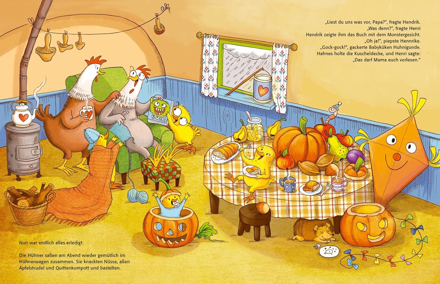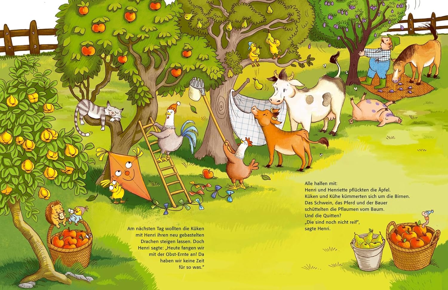 Seit Henri seinen Küken eine Gutenachtgeschichte mit einem Monster vorgelesen hat, fühlt er sich im Dunkeln manchmal etwas unbehaglich. Aber das würde er natürlich nie zugeben – schließlich ist er ein stolzer Hahn! Doch eines Tages fliegt der selbstgebastelte Drachen der Küken davon, und genau an diesem Abend entdeckt Henri in den Ästen des alten Quittenbaums eine Gestalt, die wirklich fast wie ein Monster aussieht! Alle Tiere des Bauernhofs helfen mit, das Geheimnis zu lüften.