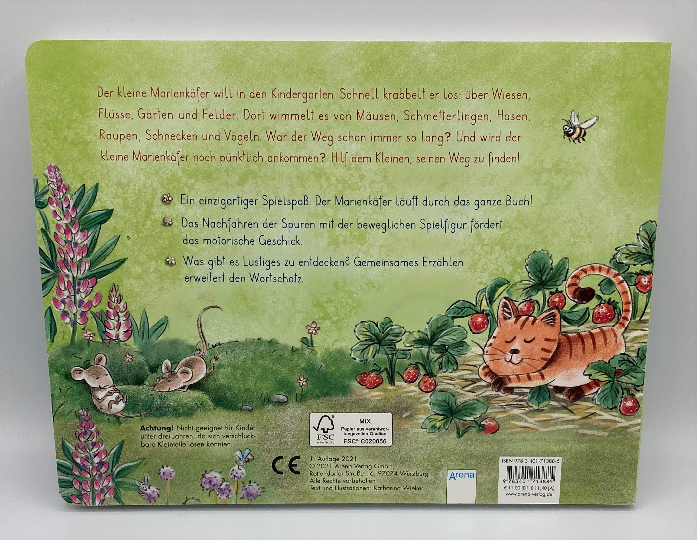 Schnell krabbelt er los: Über Wiesen, Flüsse, Gärten und Felder. Dort wimmelt es von Tieren: Mäusen, Schmetterlingen, Hasen, Raupen, Schnecken und Vögeln. War der Weg schon immer so lang? Und wird der kleine Marienkäfer noch pünktlich ankommen? Hilf dem Kleinen seinen Weg zu finden!