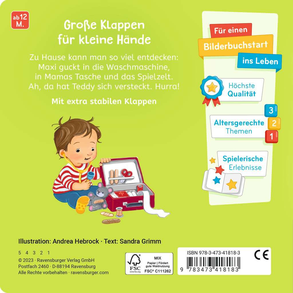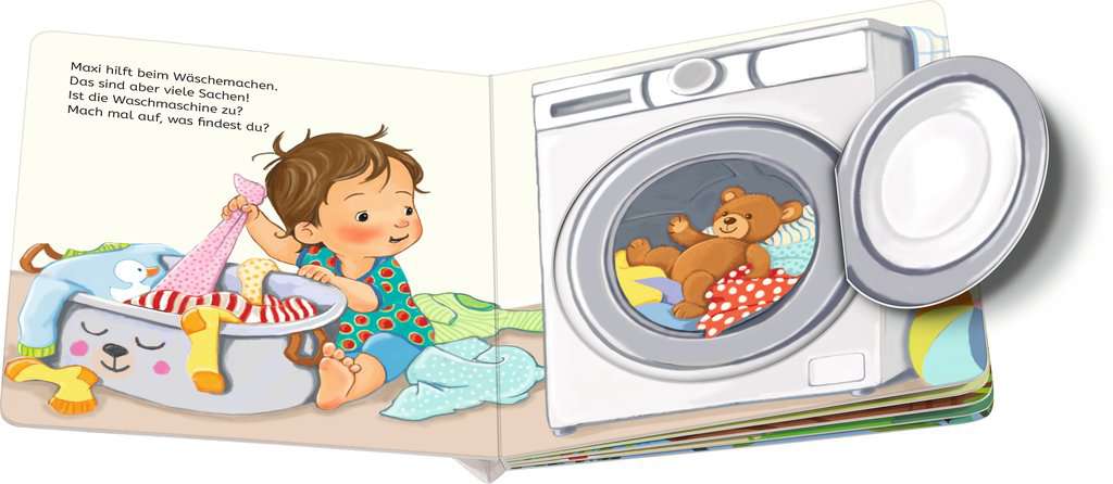 Was ist in der Waschmaschine? Hurra, hier ist Teddy! Und in der Wickeltasche? Da findet Maxi Schnuller und Schnuffelhase.