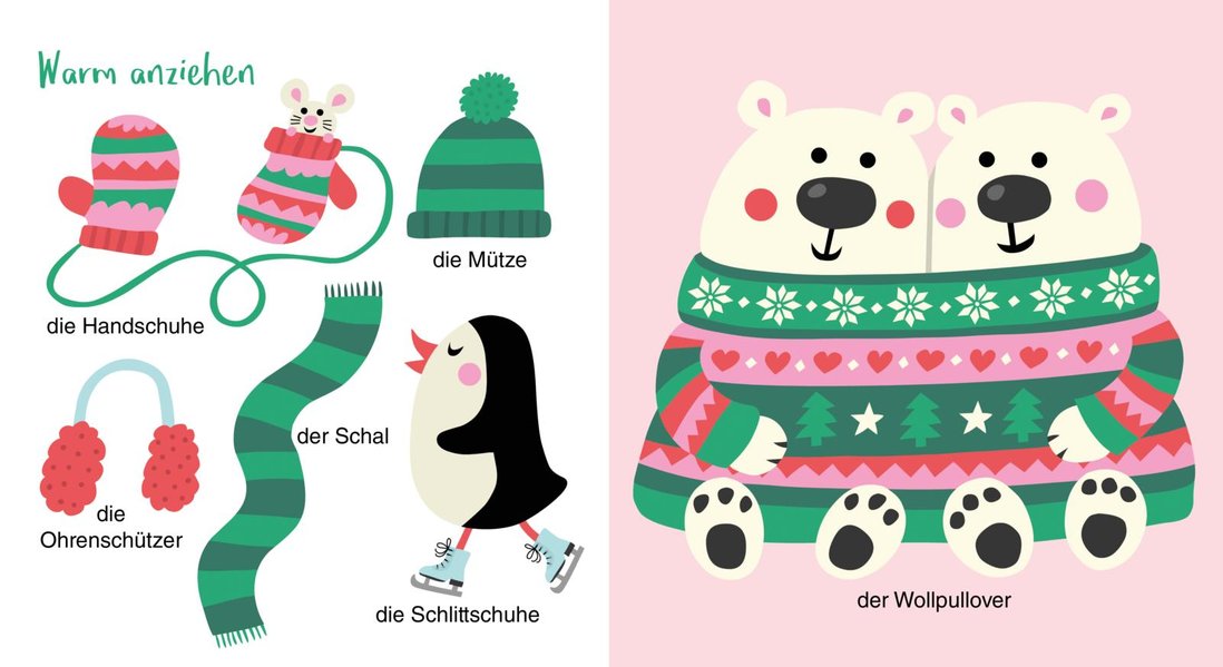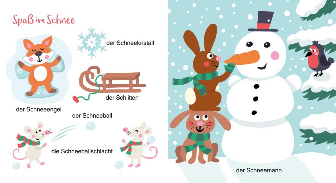 Zur Winterzeit gehören die ersten Schneeflocken genauso wie warmer Kakao und bunter Weihnachtsschmuck, kuschelige Mützen und leckere Kekse – und natürlich ein dicker Schneemann! Ein erstes Bildwörterbuch rund um Winter und Weihnachten – farbenfroh illustriert für die Allerkleinsten.