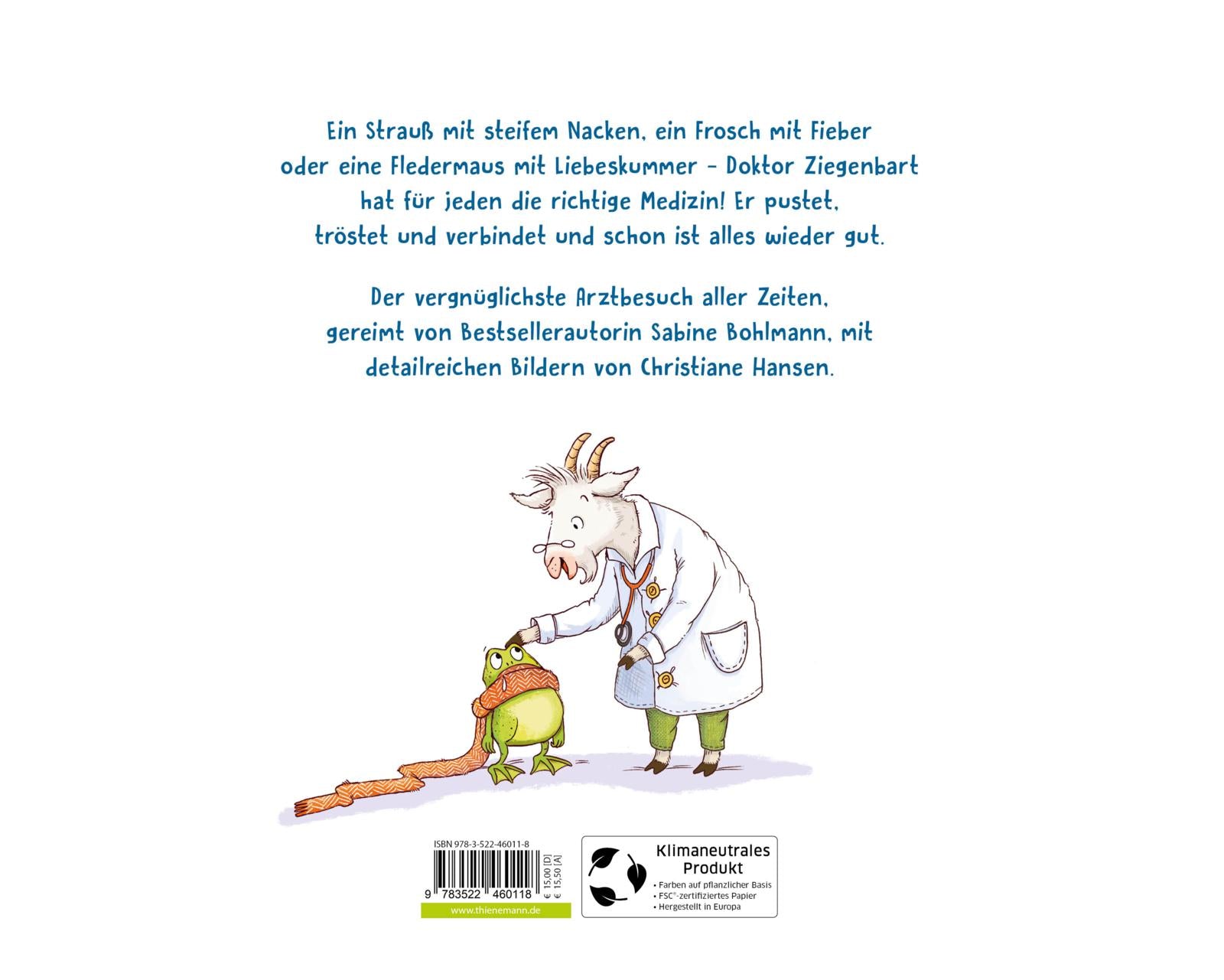 Ein Strauß mit steifem Nacken, ein Frosch mit Husten oder eine Fledermaus mit Liebeskummer – für alle hat Dr. Ziegenbart die richtige Medizin. Bestsellerautorin Sabine Bohlmann reimt sich einmal quer durchs Tierreich und nimmt ganz nebenbei kleinen Kindern die Angst vor dem Arztbesuch. An den detailreichen Illustrationen von Christiane Hansen kann man sich kaum sattsehen.